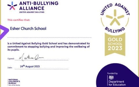 At Esher Church School, we are committed to reducing bullying and improving well-being for all pupils. In recognition for all our hard work and the impact on our children and staff, the United Against Bullying (UAB) programme awarded the school the United Against Bullying GOLD School status.