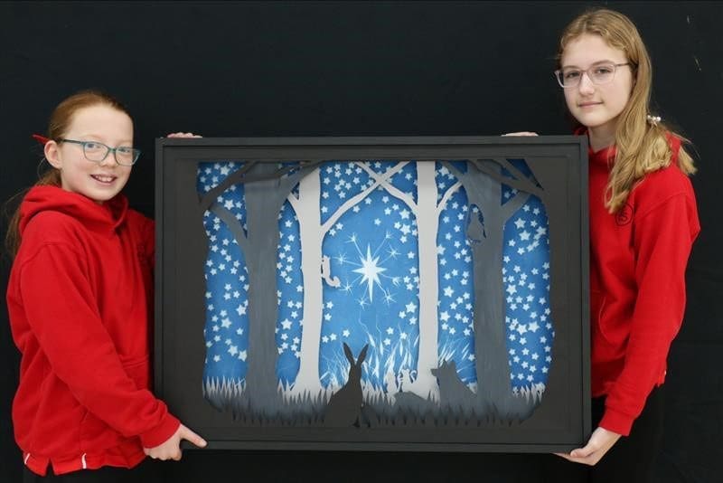 The artwork was created by every child and adult hand cutting a star. Our art prefects used them to create a cyanotype print (a form of photography using daylight to develop) as a backdrop. They then created a diorama, hand cutting layers of card to show how the light can shine even in the darkness, and our caretaker Mr. Macdonald made a frame for it.