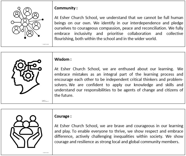 At Esher Church School, our vision and values are at the heart of all we do, representative of a collaborative effort, involving the voices of our entire community— staff, volunteers, trustees, parents/carers and children. This inclusive process allowed us to create a vision that truly reflects our shared beliefs and values, grounded in Christian teachings.